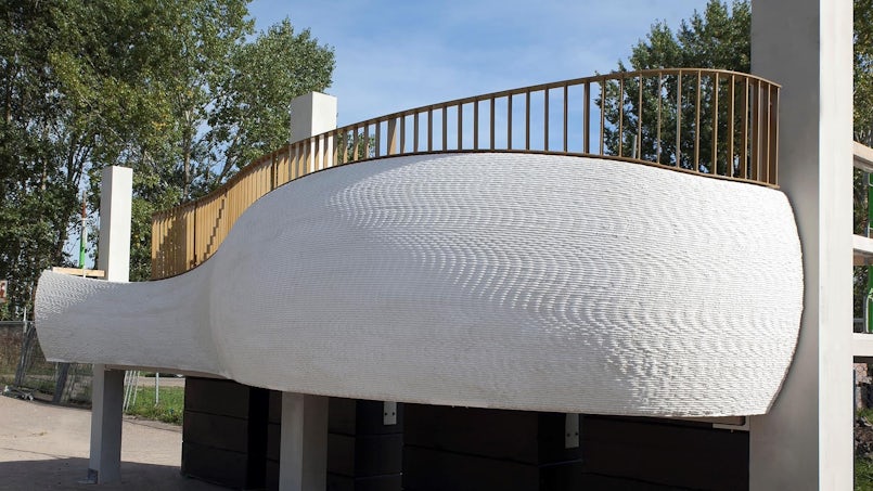 “We hebben een paar jaar nodig gehad om de engineering goed te krijgen”, vertelt Engelenburg. Zo heeft Bruil een speciale printerkop ontwikkeld die onder een hellingshoek kan printen. “Uittekenen, test-printen, de elementen passend krijgen binnen de gestelde maattoleranties; we hebben veel pionierswerk verzet”, vult Van Leeuwen aan. Nieuw was ook het ontwerpproces. Normaal gesproken wordt het ontwerp van de architect door de aannemer vertaald naar een werktekening, bij 3D-printen wordt het 3D-computermodel direct naar de printrobot gestuurd. “3D-modelleren met programma’s als Rhino vergt specialistische kennis”, zegt Engelenburg. “We hebben daarvoor veel contact gehad met Kokon. Het model dat de ontwerpers aanleverden is door de ingenieurs van Movares getoetst op constructieve eisen, zoals waar de hijspunten moesten komen. Wij voegden informatie toe over bijvoorbeeld zaaglijnen. Daarna was het element klaar voor productie.”