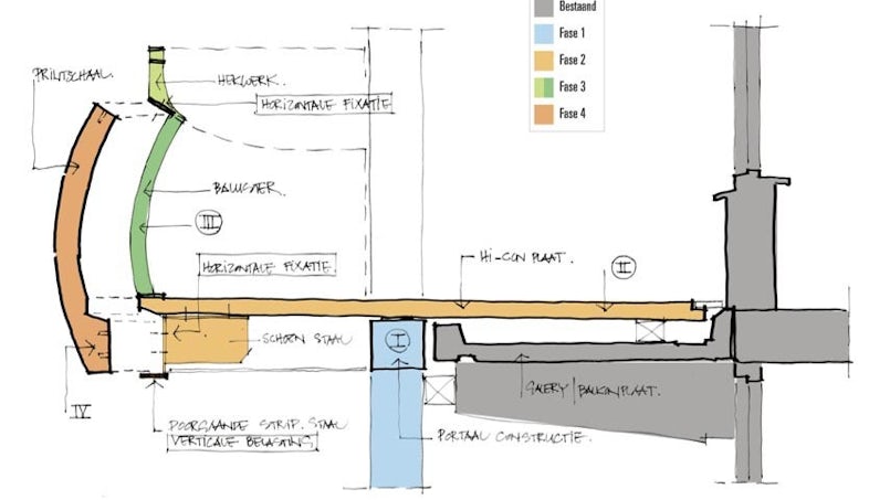 De uitdaging van het project zat niet alleen in het 3D-printen van de dubbelgekromde organische vormen, maar ook in de daarvoor benodigde constructie. De nieuwe, grotere balkonvloeren zijn van platen ultra-hogesterktebeton (UHSB) gemaakt, dat over de bestaande balkons is geplaatst. De 3D-geprinte balkonschermen zijn met behulp van stalen ‘schoentjes’ aan ankers aan de balkonplaten verankerd. De balkonplaten zorgen voor de belastingafdracht van de balkonschermen naar de nieuwe prefab betonnen kolom- en portaalconstructie die voor de flat is geplaatst. De betonnen frames zijn met stalen koppelstukken vastgemaakt aan de consoles van het bestaande gebouw, om de windbelastingen op de balkonschermen af te dragen aan het bestaande gebouw.