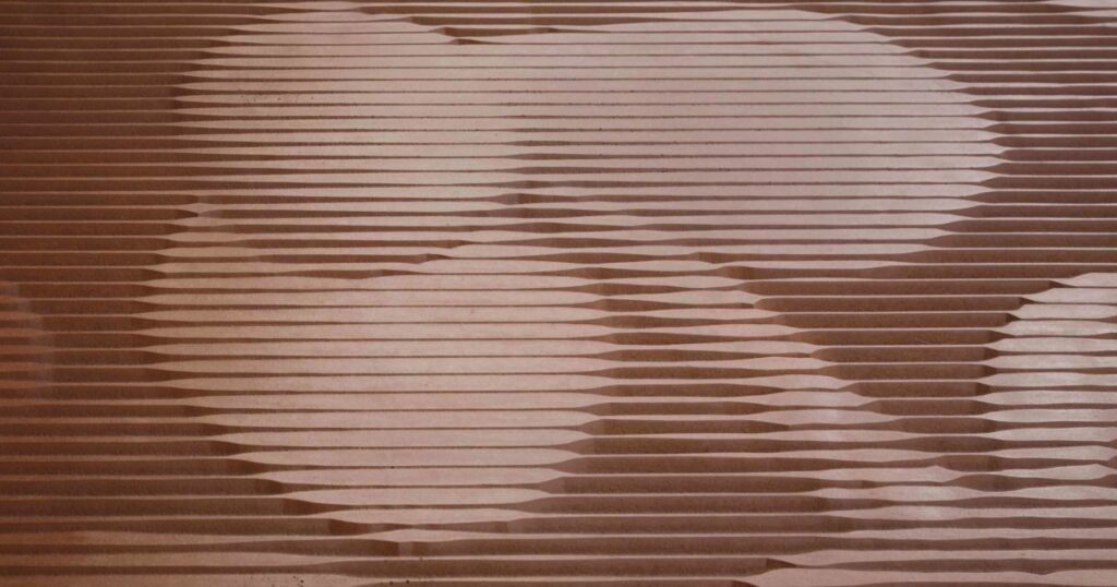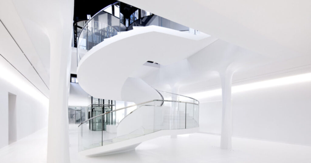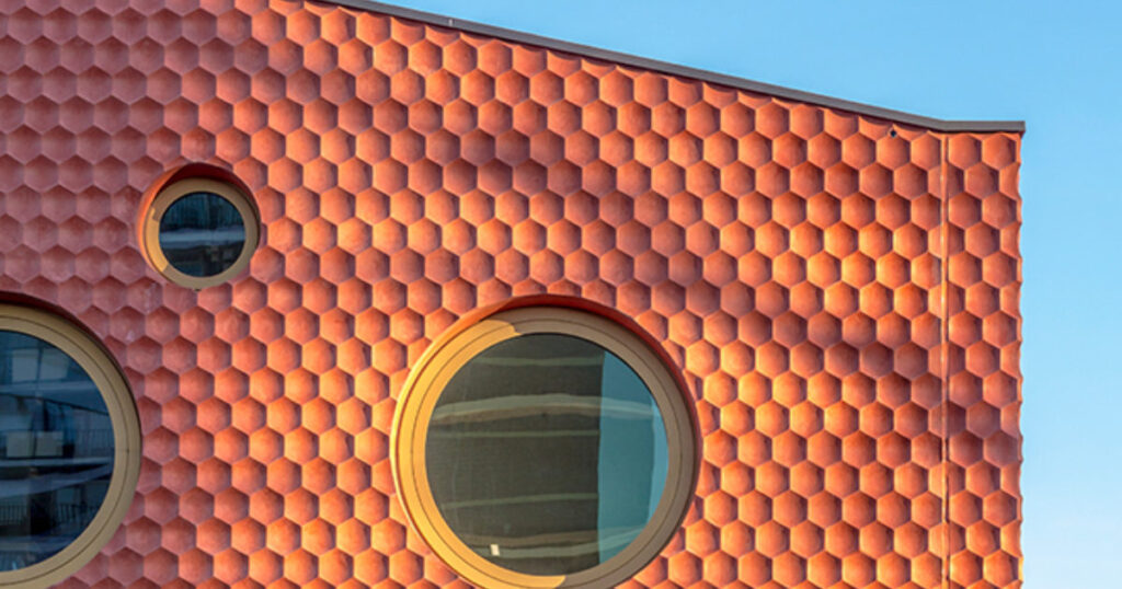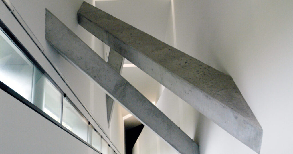 De gestapelde lagen van de museumzalen van Naturalis in Leiden worden onderbroken door banden van witte betonpanelen met een doorlopend driedimensionale reliëfstructuur.