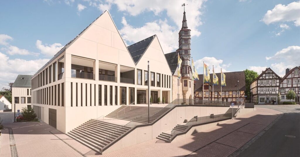 Heimspiel Architekten e.a. | Met vrijkomende grondstoffen uit het bestaande pand is op dezelfde plek een nieuw stadhuis gebouwd.