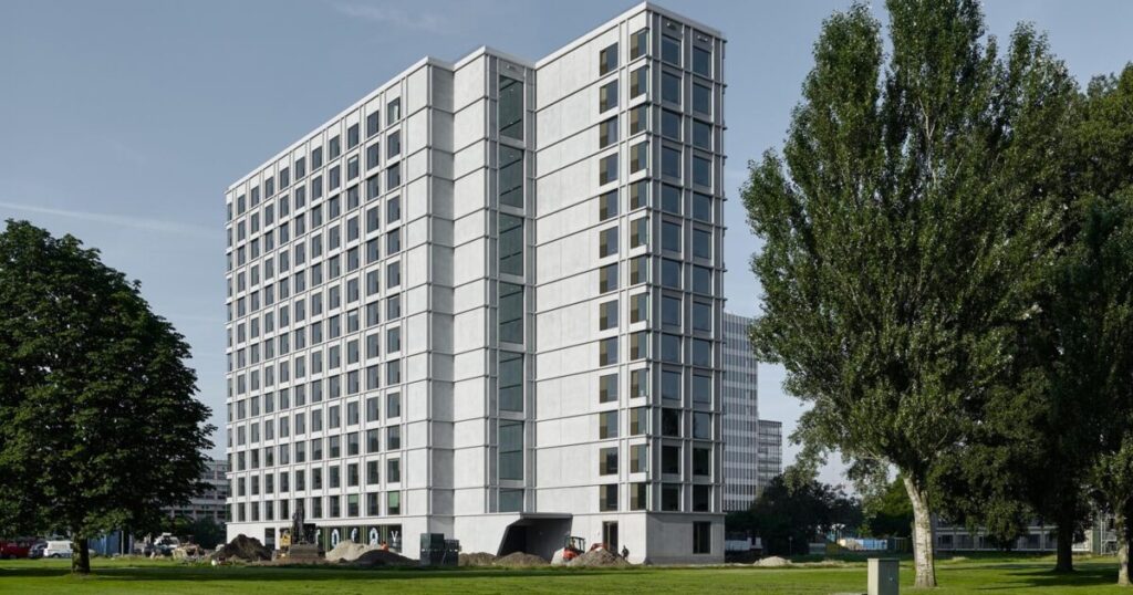 Aurora is de eerste permanente studentenhuisvesting op de TU Eindhoven, volledig gebouwd met prefab beton. Het project combineert snelheid, duurzaamheid en esthetiek in een flexibele opzet die ook na negen jaar nog fris oogt.