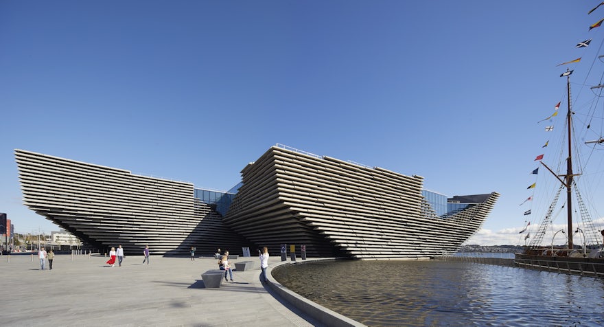 Kengo Kuma & Associates | Prefab beton lamellen bevestigd op overhellend betonnen casco verbeelden een ruw natuuroppervlak.