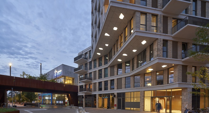 HilberinkBosch Architecten | Gedraaid overstekende verdiepingen worden geaccentueerd door witte betonband in wooncomplex Upstairs.