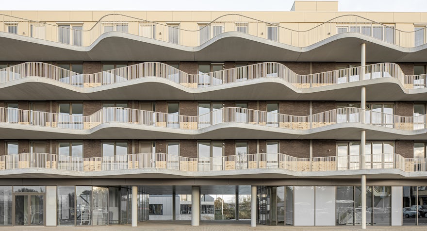 Jeanne Dekkers Architectuur + Zoetmulder | De gegolfde vorm van de prefab balkons refereert aan het alom aanwezige water.