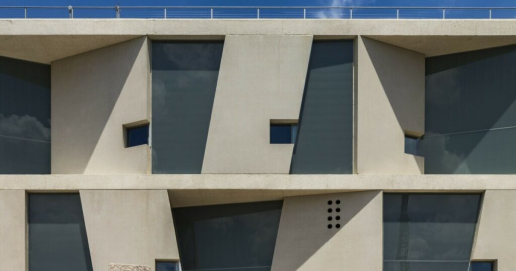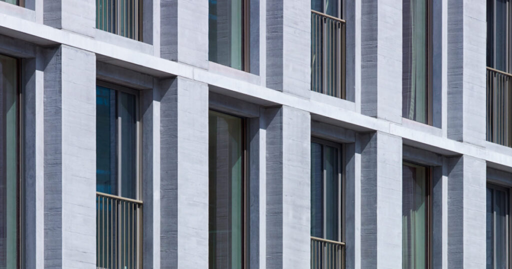 Steven Holl Architects | Gevel van dragende prefab betonelementen, schuin gesneden, op een aantal plekken in horizontale richting geroteerd.