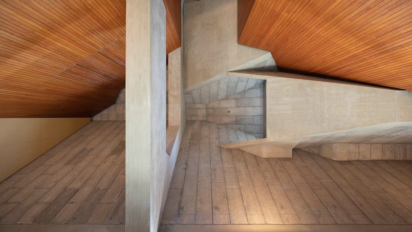 Binnen is de afwerking van de wanden niet overal in de oorspronkelijke staat. De eenvoudige maar kleurige mozaïeken zijn er nog, maar veel van de grenenhouten lamellen zijn vervangen door veel netter ogend bamboe. De klimaatbeheersing van dit rijksmonument blijft zoals bij veel grote betonnen gebouwen problematisch.