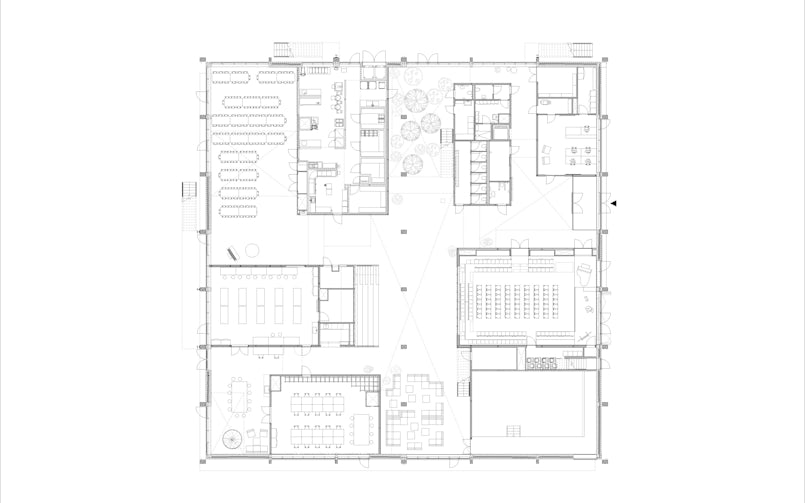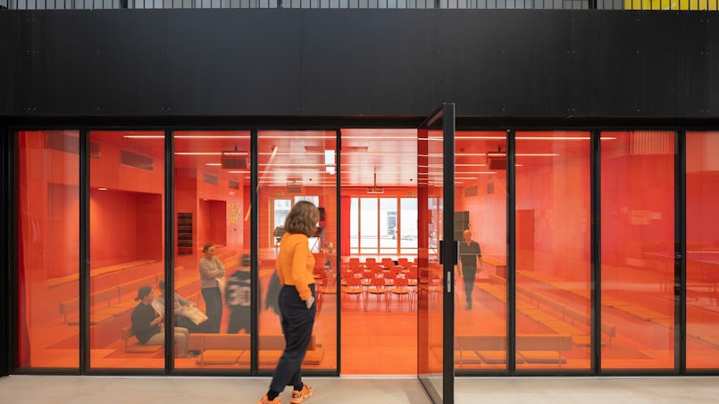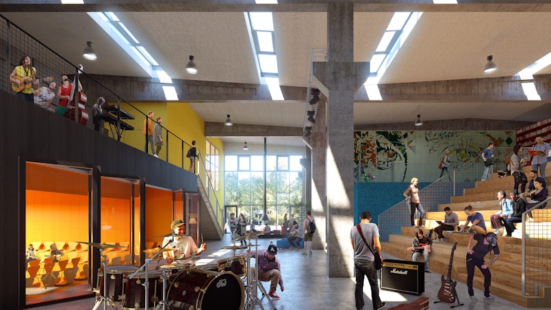 De verschillende onderwijsfuncties zijn in de vorm van zestien lichtgewicht ‘dozen’ in de hal ingepast, elk met een eigen kleur en afwerking; het auditorium is bekleed met oranje akoestische panelen, de danszaal knalgeel geschilderd. Om het beton onaangetast te laten, zijn de nieuwe wanden geschikt gemaakt voor creatieve uitingen. Zo is de architectuurruimte bekleed met blauw kurk, waarop studenten hun tekeningen kunnen vastprikken. Daar waar de binnenwanden van de ‘onderwijsboxen’ het bestaande gebouw raken, is rondom het beton getimmerd.
