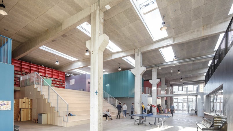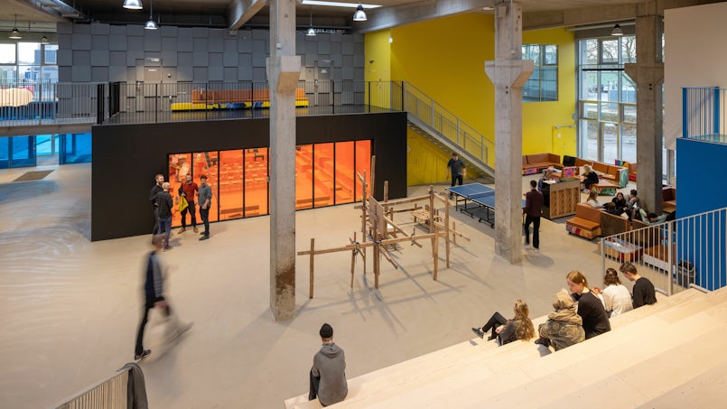 Een oude cementfabriek in de Deense stad Roskilde is omgetoverd tot een bruisend onderwijsgebouw. Door hergebruik van de betonnen draagconstructie bleef de ‘ruige’ sfeer behouden, en de CO₂-voetafdruk beperkt (foto: Rasmus Hjortshoj COAST)