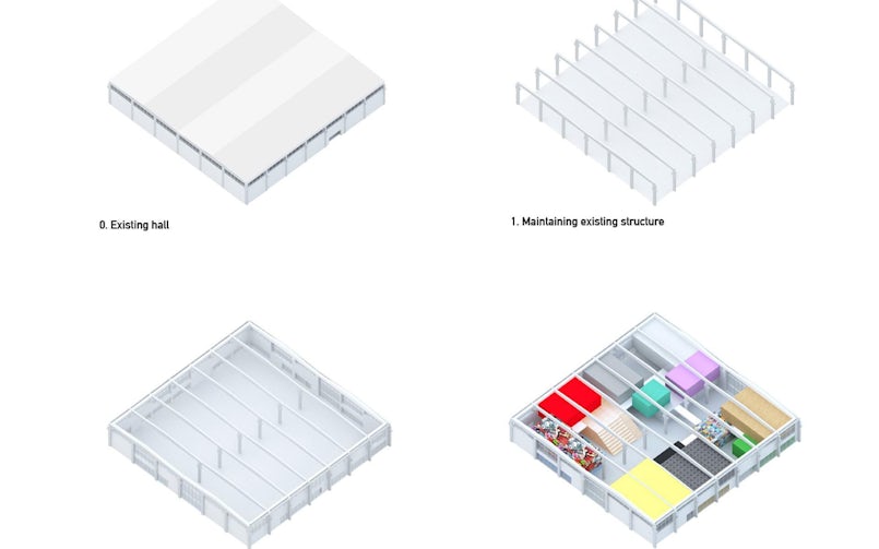 De bestaande fabriekshal, 42 bij 35 m, 7 m hoog, is opgebouwd uit betonnen kolommen en liggers op een grid van 6×7 m2. Zich bewust van de impact die de productie van nieuw beton op het klimaat heeft, en de goede, robuuste kwaliteit van de bestaande draagconstructie, was hergebruik daarvan een logisch uitgangspunt voor het ontwerp. Dit is één van de mogelijkheden voor circulair beton. ‘Het behouden van de betonconstructie met zijn ruige uitstraling was bovendien belangrijk voor ons om de informele sfeer te creëren die past bij het vrije, creatieve onderwijs, dat aansluit bij de traditie van het internationaal bekende Roskilde-festival’, vertelt architect Aser Giménez-Ortega van MVRDV.