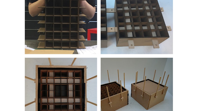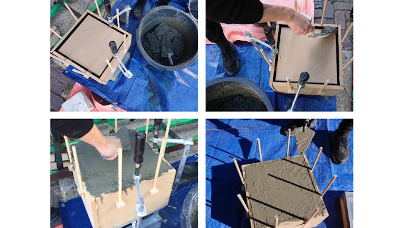 In de eerste teststort werd het karton omhooggedreven door het beton. Hiertoe hebben ze strips ontwikkeld die het raster naar alle kanten op zijn plek houdt, en vooral de opdrijvende kracht omhoog.