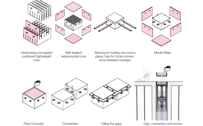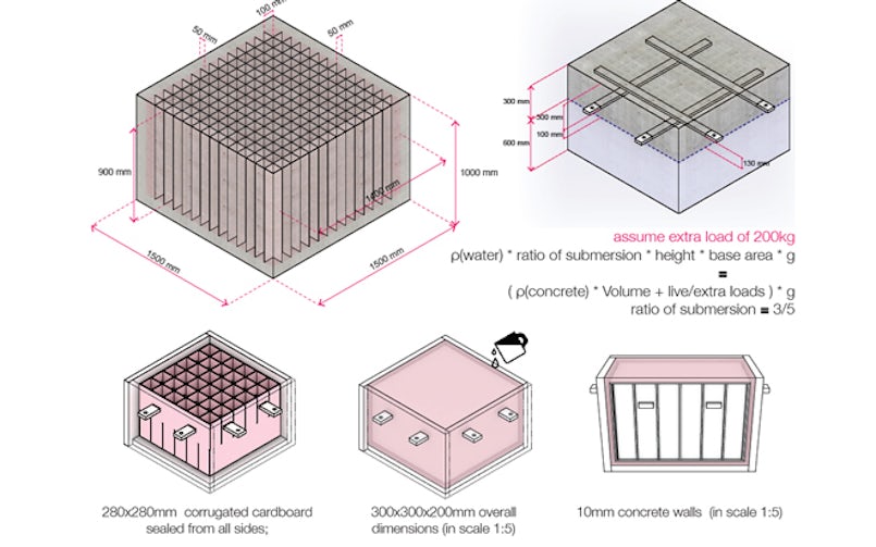 Op festivals en andere tijdelijke toepassingen worden vaak plastic elementen gebruikt om een drijvend platform aan te leggen. Beton heeft een lange levensduur, dus wanneer het platform opgebouwd wordt uit modulaire elementen, dan kunnen de elementen telkens opnieuw ingezet worden. Het studententeam Modular Optimization van de TU Delft wilde niet het beton zelf lichter maken, omdat dit volgens hen ook aan de sterkte concessies doet, maar de module van een holle kern voorzien.