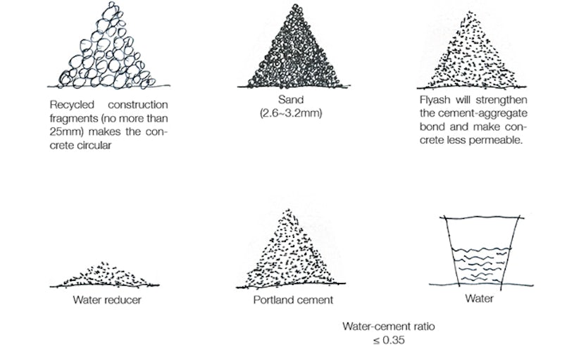 Het element moet zijn drijfkracht behouden en daarom is het noodzakelijk dat het zich niet volzuigt met water. Door poederkoolvliegas (as uit de kolencentrale) toe te voegen en plastificeerders (die het beton vloeibaar maken zonder meer water toe te voegen) wordt het beton dichter van structuur.