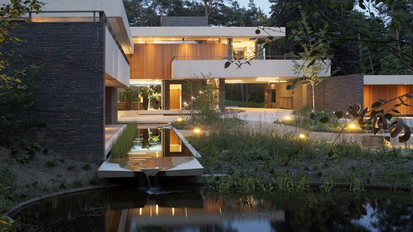 De villa is opgenomen in de natuur. De waterpartij bij de entree loopt bij overtollig water via een betonnen spuwer in de vijver (foto: René de Wit)