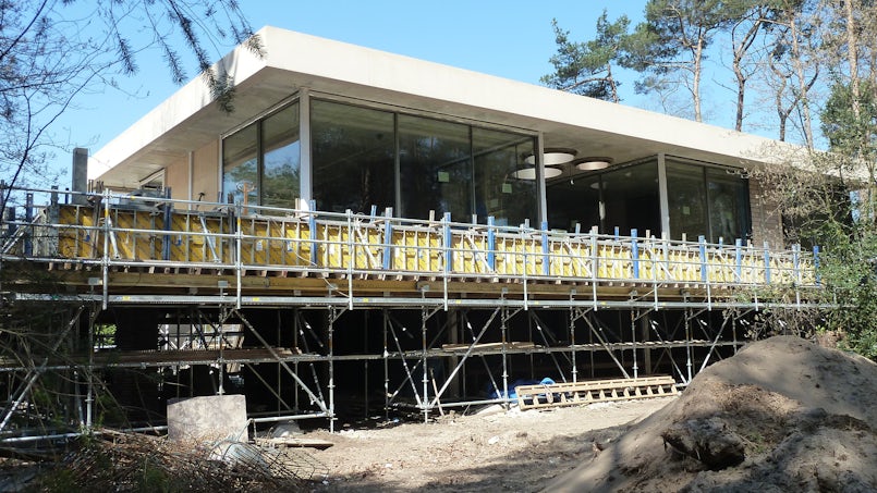 De banden die tegelijk ook borstwering van het balkon zijn, hebben door hun hoogte een versteviging van de bekisting nodig. De gaten waar de centerpen heeft gezeten, worden in het zicht gelaten (foto: René de Wit)