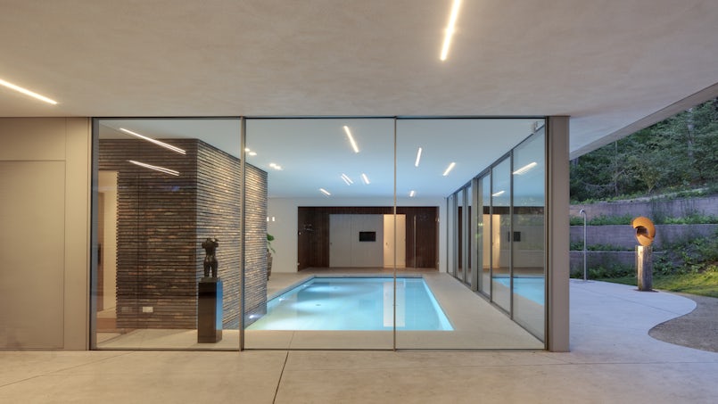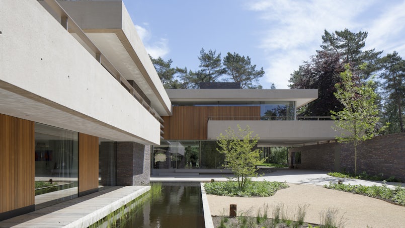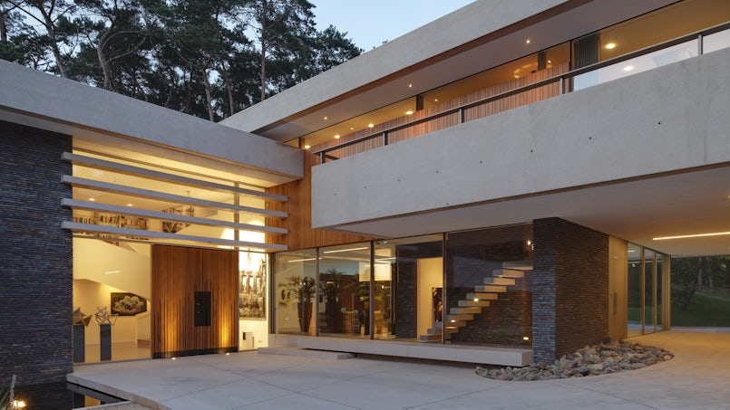 De L-vorm van de woning, met de rug het duin ingeschoven, omarmt een gecultiveerd binnenhof. De betonnen terreinverharding golft vanuit het hof de natuur in en is doorgezet in het interieur waardoor de vloer van het zwembad, bij openzetting van de grote puien, doorloopt in de natuur. Hoogteverschillen en trappen zijn in eenzelfde beton uitgevoerd, binnen en buiten worden letterlijk verbonden. De vloer heeft hierbij verschillende bewerkingen gekregen: binnen hoog glanzend gepolijst, buiten grof geschuurd, en alle variaties daartussen.