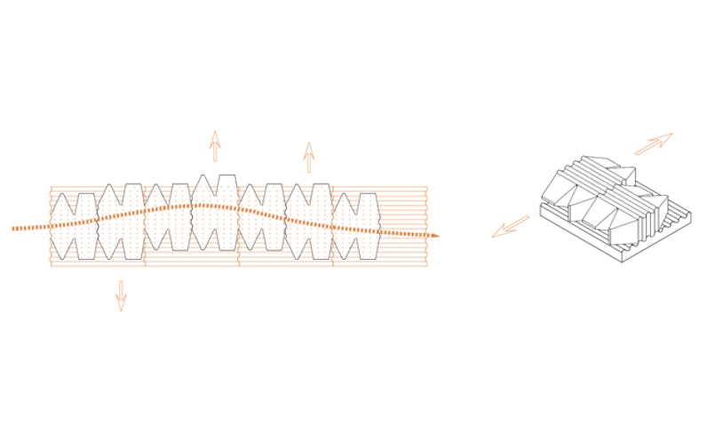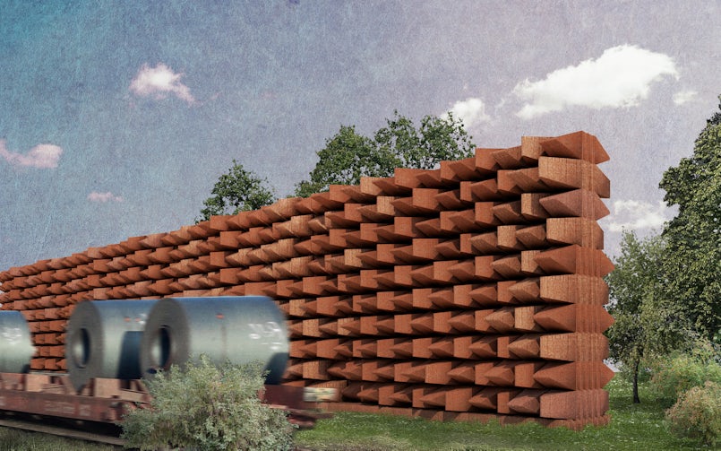 Een modulaire geluidsbarrière, ontworpen om eenvoudig te installeren en het geluid zo goed mogelijk tegen te houden. De unieke vorm komt voort uit het vooronderzoek dat de studenten hebben gedaan in anechoïsche kamers, die ontworpen zijn om geluid maximaal te dempen. Een onderzoek naar een optimale betonmix en de vorm zorgen er samen voor dat het geluid zo goed mogelijk wordt tegengehouden. Dit soort geluidswallen vormt een steeds belangrijker element in het leefbaar houden van onze woonomgeving.