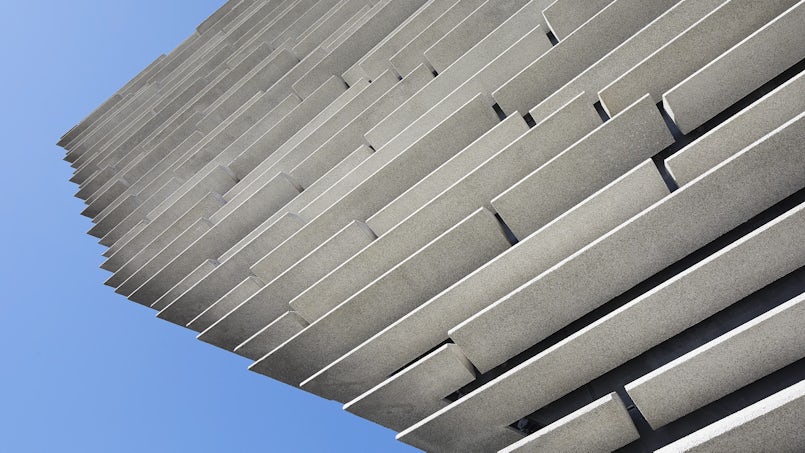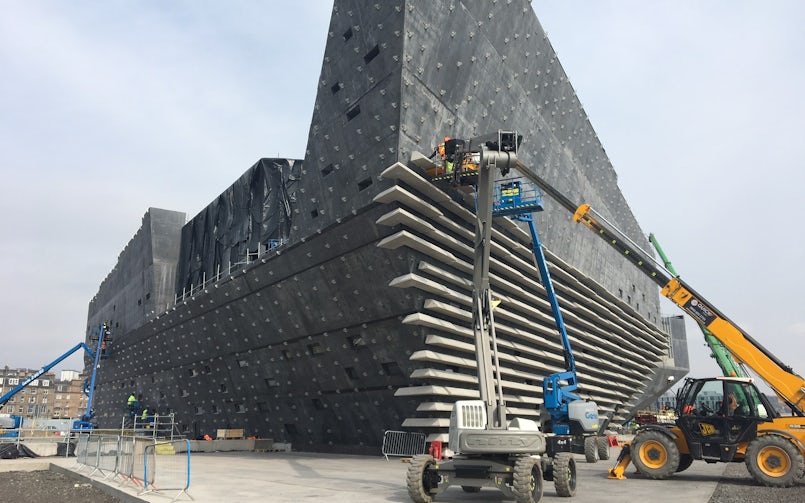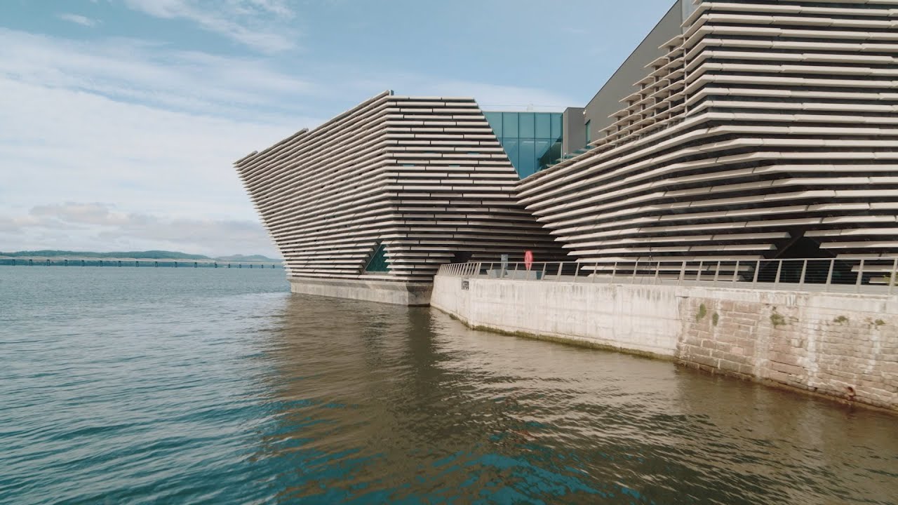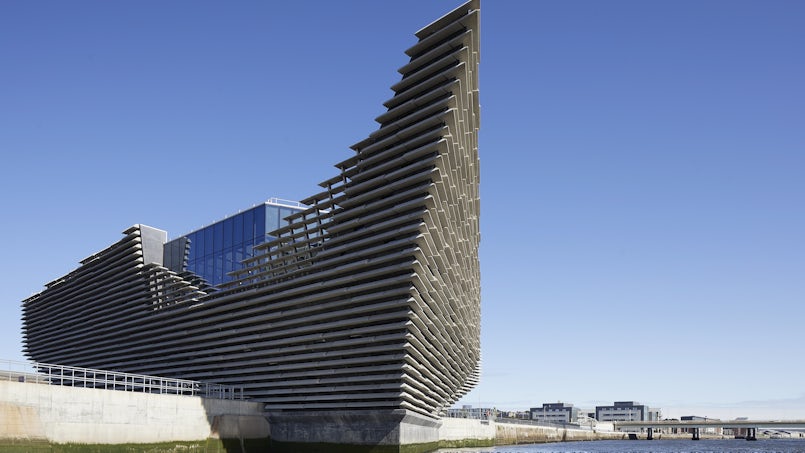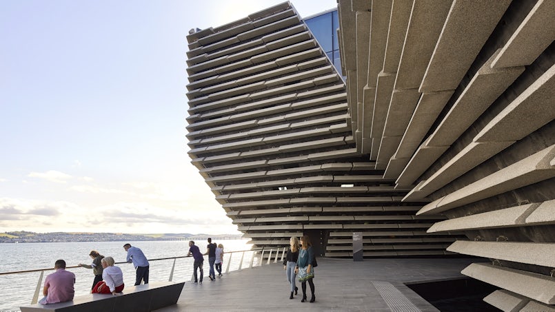 Op de grens tussen land en water staat het Victoria & Albert Museum in Dundee, een stad in het noorden van Schotland. Het ontwerp van Kengo Kuma & Associates heeft overhellende gevels, opgebouwd uit vlakken die steeds onder een andere hoek staan. Horizontale banden van geprefabriceerd beton benadrukken de complexe contouren van het museum. Het volume krijgt zodoende een gelaagdheid, die doet denken aan uitgesleten krijtrotsen.