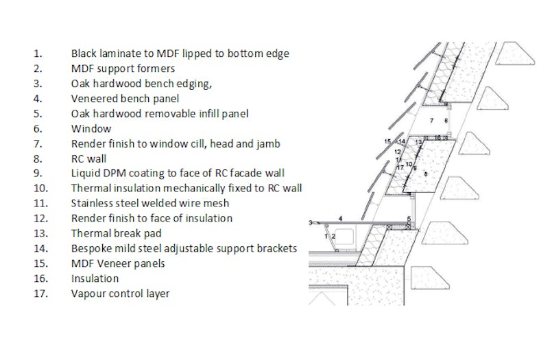 De betonplex bekisting van de in het werk gestorte hellende gevels is met CNC-machines uitgefreesd op basis van de gegevens uit het 3D-model. De bekisting is in delen geproduceerd. In de betonwanden zijn kanalen ingegoten ten behoeve van de bevestiging van de prefab gevelelementen.