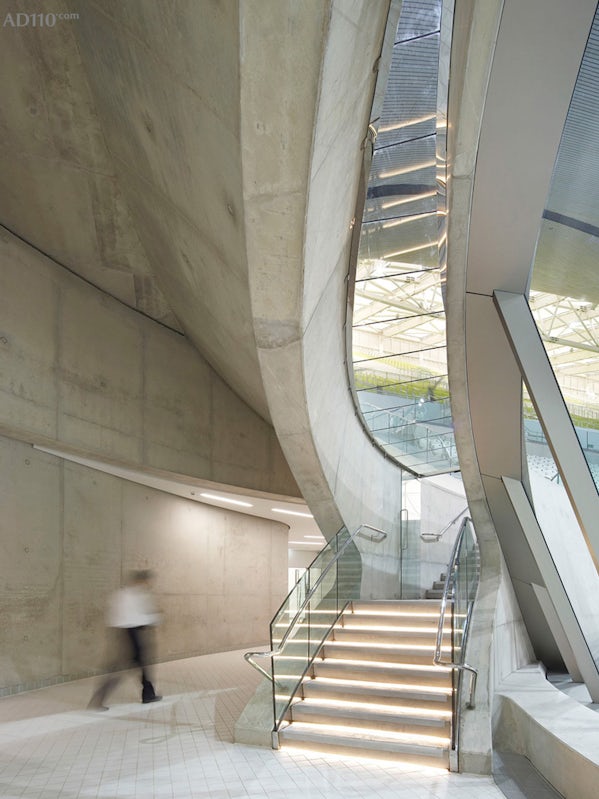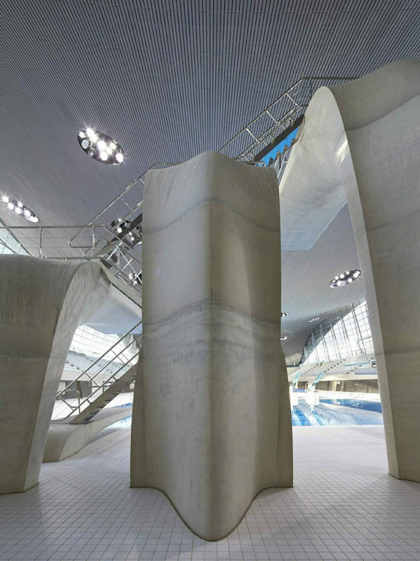 De vloeiend vormgegeven wanden van schoon beton bepalen voor een groot deel het karakter van het Aquatics Centre in Londen. Ze begeleiden de bezoekers vanaf de entree via de trappen naar de tribunes, naar het podium en de op een lagere vloer gelegen trainingsfaciliteiten.
