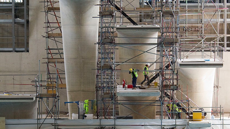 Om de wapening te vlechten en de mallen te plaatsen was extensief steigerwerk noodzakelijk (foto: Zaha Hadid Architects)