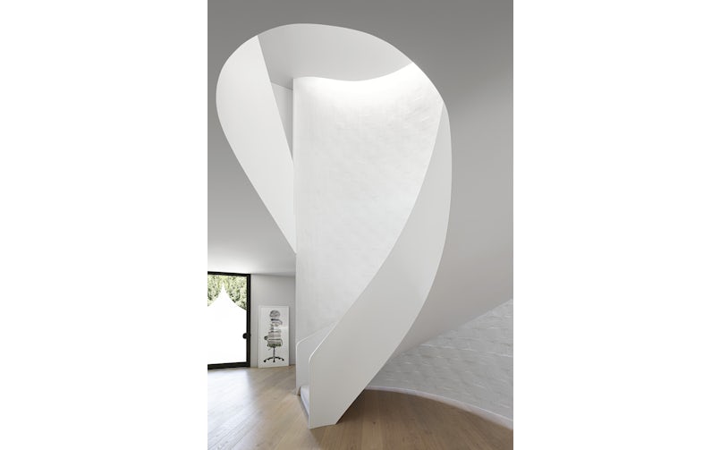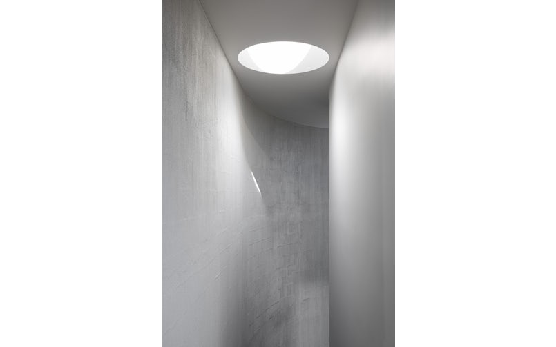 Het huis is opgebouwd uit een geïsoleerde houten draagconstructie waarop aan de buitenzijde wapeningsstaal is aangebracht. Vervolgens kwam een betonwagen voorrijden en is met spuiten een laag van 180 mm beton aangebracht dat met een grote stalen ‘pleisterspaan’ is gladgestreken. “Het was geen precies karwei, dat is wat we aantrekkelijk aan deze aanpak vonden, de natuurlijke look die daaruit ontstaat”, zegt de architect. “Het was wel een risico om het op die manier te doen, maar onze opdrachtgever gaf ons veel vertrouwen. We hebben lang gezocht naar een aannemer – LBA Construction Group – die het aandurfde, en gelukkig hadden we met Clive Steele Partners een fantastische constructie-adviseur. Zij berekenden precies hoeveel wapening we waar nodig hadden, en wat de samenstelling van het beton moest zijn. Als het beton te vloeibaar is, drupt het van de gevel, is het te stroperig, dan kun je het niet goed uitsmeren. Op locatie hebben we samples getest om de juiste balans te vinden.” Het gebruikte beton is een standaard soort, die door toegevoegde stoffen iets sneller uithardt.