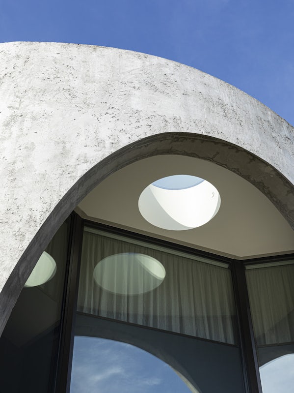De duurzaamheid van het project schuilt niet alleen in het vernieuwende gebruik van beton-zonder-bekisting, maar ook in de zonnepanelen op het dak, waar – eveneens voor het oog verborgen – een watertank van 20.000 liter is geïnstalleerd voor de opvang van regenwater. De thermische massa van het beton, passieve dwarsventilatie, en led-verlichting dragen bij aan de energiezuinigheid van het gebouw. Omdat je met spuitbeton niet precies kunt werken, sluit de betonnen gevel niet aan op de kozijnen; deze zijn terugliggend ontworpen. Op deze manier bieden de grote overstekken van de bogen, samen met zonwering en hoogwaardig isolatieglas, bescherming tegen de felle zon en regenbuien.