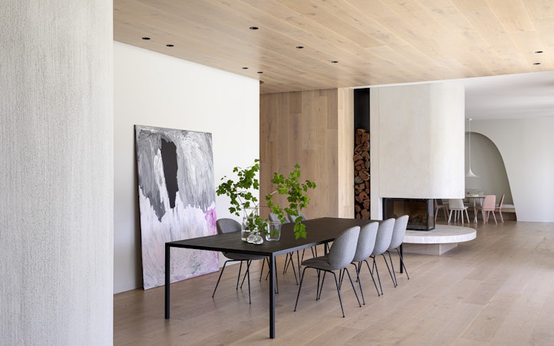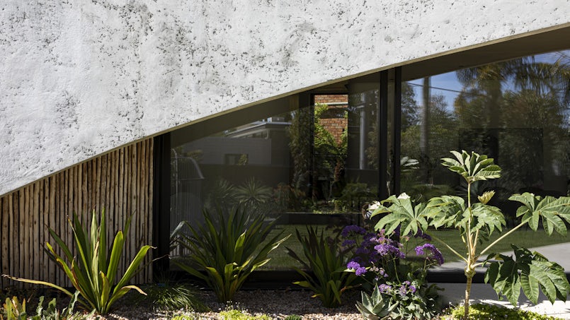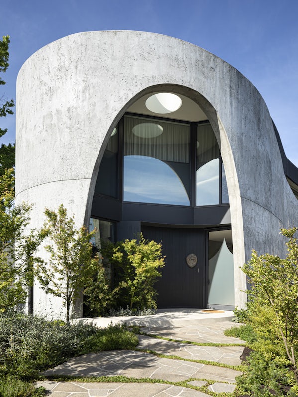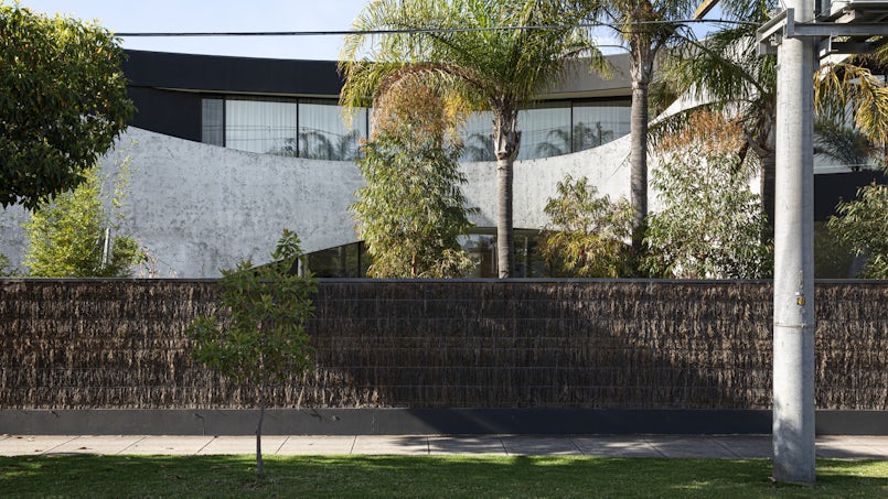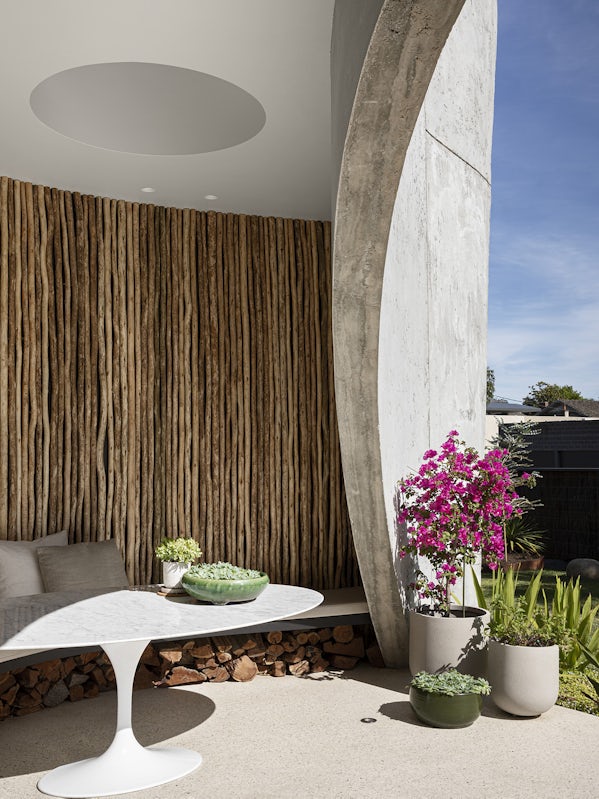 De architecten lieten zich inspireren door het typisch Australische brush fence dat rond het kavel staat, gemaakt van lange ‘bezemtakken’, gevat tussen staaldraden, met een rustieke look. Vandaar de naam Brush House. Het idee van het huis, dat op een hoek staat, is dat het geen voor- en achterkant heeft, maar zich presenteert als een vloeiende vorm die zich met een aantal grote bogen opent naar de weelderig begroeide tuin. Een huis als een stevige oesterschelp, dat beschutting biedt tegen de elementen terwijl de sfeer van het interieur, afgewerkt met hout, stuukwerk en tegels, juist zacht en warm is.