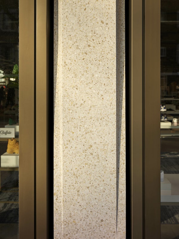 De kolommen op de begane grond zijn gepolijst. Het beton heeft daardoor een terrazzo uitstraling en het gladde oppervlak is minder gevoelig voor opspattend vuil en beschadigingen. Voor een nauwe aansluiting op het maaiveld zijn passtukken (neuten) gegoten van hetzelfde betonmengsel. Op de verdiepingen erboven heeft de oppervlaktetextuur juist een satijnen glans. Dit komt doordat het beton gezuurd is. Na het ontkisten en uitharden zijn de elementen verzadigd met water en vervolgens besproeid met een oplossing van 17% waterstofchloride en 83% water. Het zuur etst de kalkhoudende delen in het cement weg, waardoor het zand in het betonmengsel wordt blootgesteld.