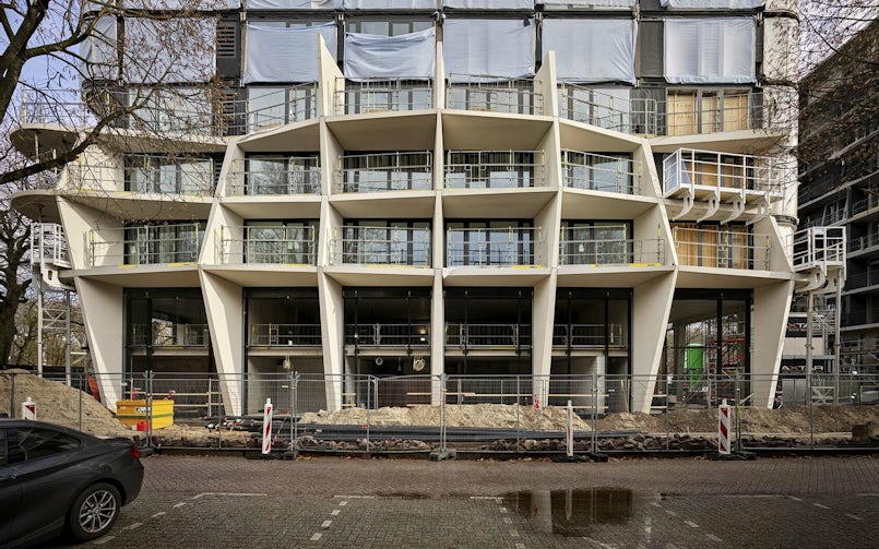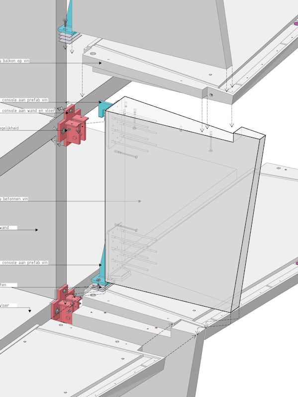De verticale vinnen zijn aan de constructie gehangen en daar liggen dan weer de balkons en horizontale randen op. Alleen de afgeronde hoekbalkons zijn na bevestiging aangespannen via sparingen in de vloer, die daarna zijn dichtgestort.