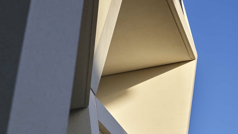 Het witte beton is gemaakt met wit cement en natuursteen toeslagmateriaal, dat goed zichtbaar is bij de lager gelegen delen die mat gepolijst zijn. De plint is gepolijst, zodat dit gladde oppervlak makkelijk schoon te houden is in verband met bijvoorbeeld opspattend water vanaf de bestrating. Daarbij geeft het een luxe uitstraling.