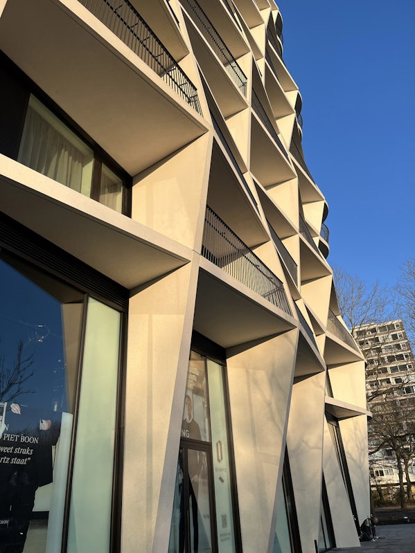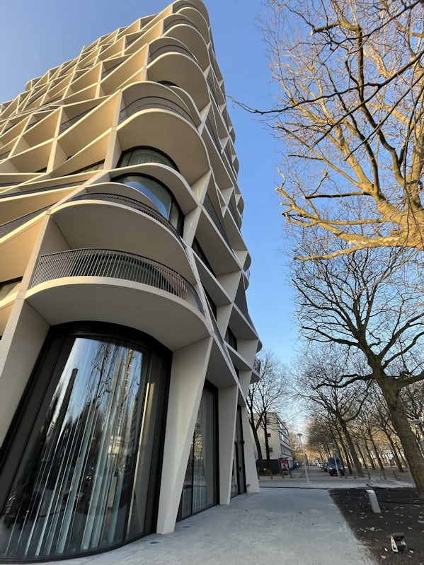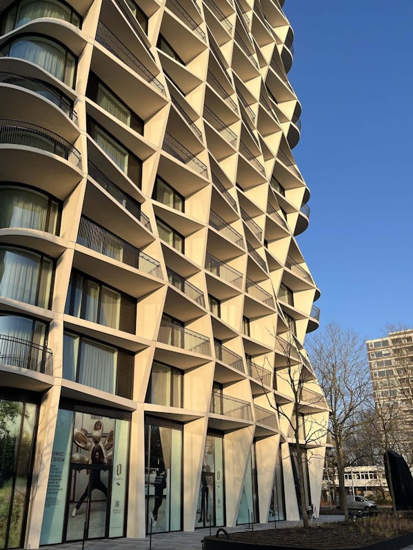 In de wijk Buitenveldert in Amsterdam, met inmiddels hoge erfgoedwaarde, werd het goed passende woningbouwcomplex Q-Residences opgetrokken: een 9-laags rechthoekig complex Qube en een woontoren Quartz van 75 meter met een bijzonder extern grid van wit beton, die de show steelt. Sudio Gang uit Chicago en co-architect Rijnboutt werkten samen met andere grote namen in landschaps- en interieur design aan de luxe uitstraling.