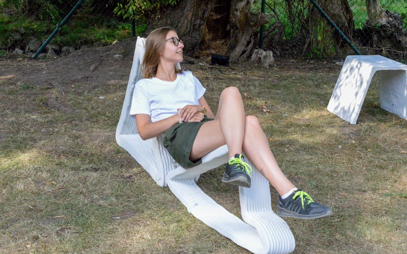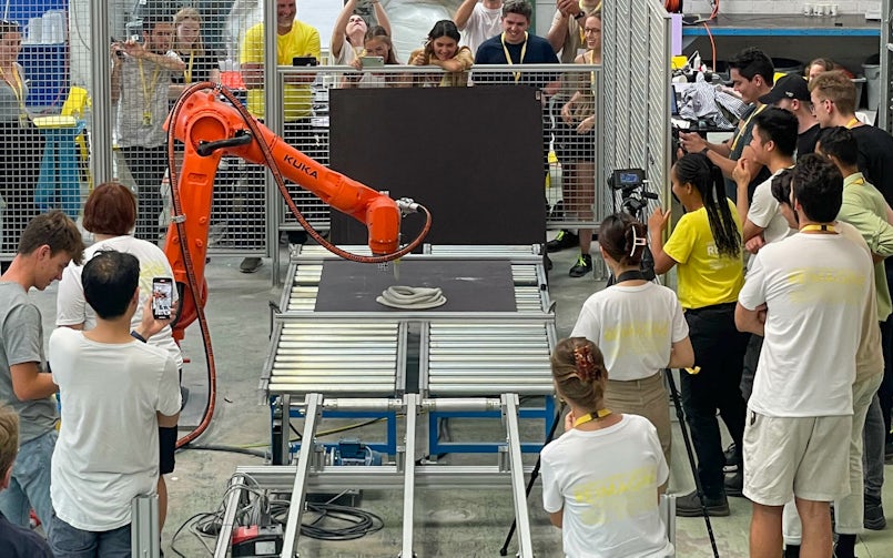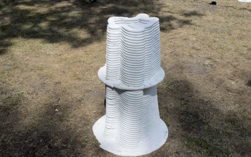 Er stond een 3D betonprinter waar de medewerkers nog mee aan het experimenteren waren. Elke combinatie van spuitmond, betonpomp en betonmengsel geeft andere mogelijkheden en dient nauwkeuring op elkaar afgestemd te worden. Het is dan ontdekken hoe lang het pad van één laag kan zijn, wat de beste hoogte van een laag is en hoever de lagen verschoven van elkaar kunnen liggen voordat de helling instort. De manier van denken van de studenten – niet gehinderd door betonkennis – leverde mooie tests op, waar ook de laboratorium medewerkers energie van kregen.