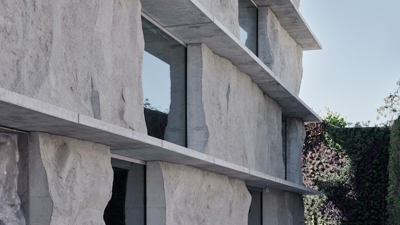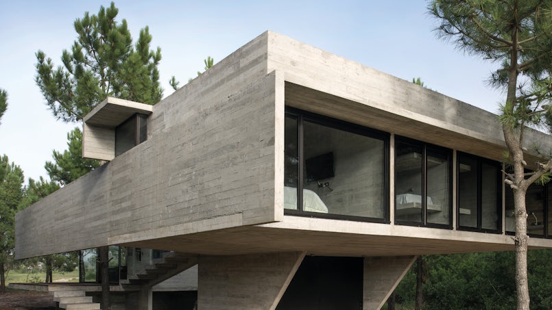 Zowel het interieur als de gevel zijn van schoonbeton, waardoor de grens tussen binnen en buiten vervaagt. Het beton heeft een natuurlijke uitstraling, omdat dennenhouten planken aan de bekisting zijn toegevoegd. Het ontwerp is van Luciano Kruk Architecten. Lees meer over Villa S+J, Costa Esmeralda.