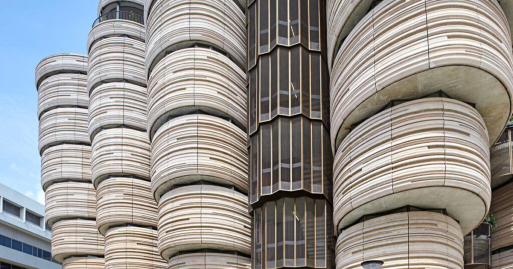 Thomas Heatherwick van Heatherwick Studio heeft met ‘gewoon’ grijs beton een spectaculaire ruimte gevormd waaraan lesruimtes liggen in acht hoge ronde torens. De gevel heeft een niet repeterend patroon omdat de smalle profielmatten steeds een andere opbouw van het reliëf toelaten. Lees meer over The Learning Hub van Nanyang Technological University.