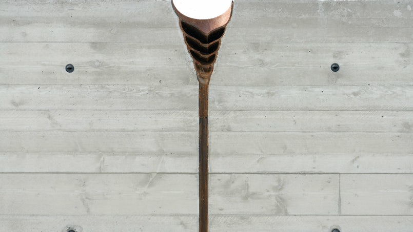 Deze stoere villa is grijs in een schakering van tinten die per stortlaag over de gehele omtrek van de gevel gestort is. Samen met de planken bekisting wilde V8 architects de villa een robuust uiterlijk geven, dat genuanceerd wordt door de subtiele details in ingestort gietijzer. Lees meer over Villa K6 in Amsterdam.