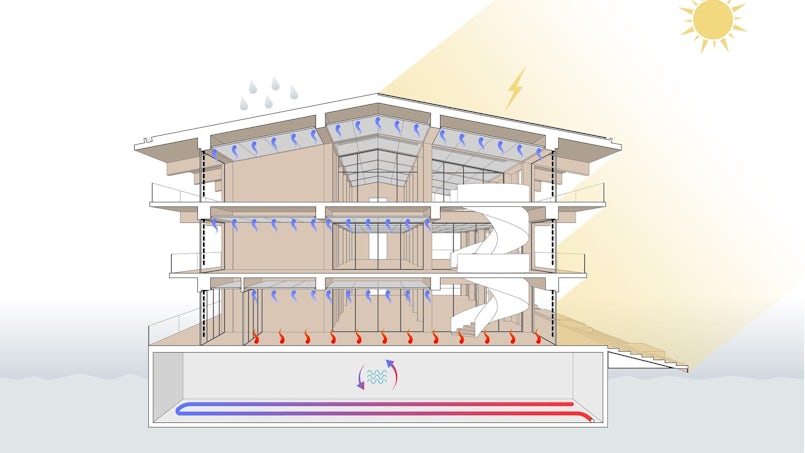 Het Floating Office is een drijvend kantoor, waarbij de onderbak van beton is gemaakt. De opbouw is van hout. “Hout heeft wellicht de zichtbare hoofdrol in het ontwerp, maar het beton is minstens zo belangrijk. Het zorgt voor stevigheid, draagvermogen en koeling. In het beton, dat in het water ligt, zitten smalle leidingen waar koelvloeistof doorheen gaat. Daarmee kunnen we het hele gebouw koelen. Een belangrijke functie, ook met het oog op de toekomst.” Duurzaamheid is een belangrijk onderwerp voor De Ru. Onder het kopje ‘sustainability’ op de website zijn voornamelijk projecten met hout in de hoofdrol te vinden. Hoe kijkt hij naar beton? “Beton zit nu ten onrechte in een verdomhoekje. Bij de productie van beton komt veel CO2 vrij. Dit kun je echter compenseren met een lange gebruiksfase. Maak je een toekomstbestendig gebouw, dan kun je deze uitstoot over langere tijd uitsmeren. Bovendien heeft beton een aantal goede eigenschappen, zoals sterkte en draagkracht. Zonde om die niet te gebruiken.”