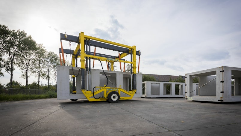 Het Circle-casco wordt op transport gezet met een straddle carrier (foto: Cascototaal)