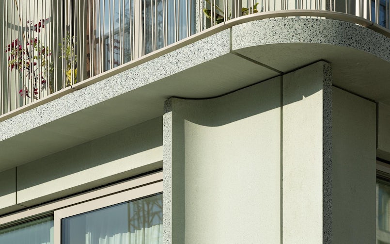 Vanuit die gedachte ontwikkelden ze samen met prefab betonproducent Byldis een karakteristieke, lichtgroene betongevel voor het sociale woningbouwproject De Jakoba in de Amsterdamse wijk Overhoeks, in opdracht van woningcorporatie Ymere. “Er werd een hoge kwaliteit gevraagd, er was weinig budget; het spel van de architect is om daarin een optimale verhouding te vinden”, zegt Herder. “De bijzonderheid zit ‘m in de kleur, ritmiek, diepte en details als de gepolijste koppen. De kostenbesparing komt allereerst voort uit tijdwinst; je hebt geen bouwsteigers nodig. Geveldelen worden met een bouwkraan op hun plek gehesen, zo win je 6 tot 9 maanden bouwtijd.”
