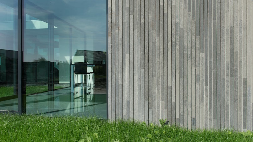 De gevelstenen zijn op sommige plaatsen afgewisseld met steenstrips. Bijvoorbeeld op de hoeken: om de hoekdetails te kunnen maken, is een natuursteen strip vervaardigd zonder betonnen onderlaag. Ten slotte zijn de gevelstenen gehydrofobeerd. ‘Door een slimme coating kan het vocht er niet in, maar wel uit.’