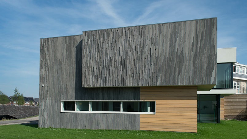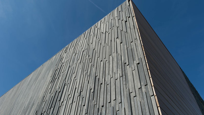De grijs genuanceerde langformaat stenen zijn volledig verticaal gemetseld. Er moest mortel over lange zijde worden omgeklapt en bovendien wilde de architect op diverse plaatsen reliëf. Om daarbij te zorgen dat de voegen achteraf zo min mogelijk in het oog zouden springen, is gewerkt met dunmortel.