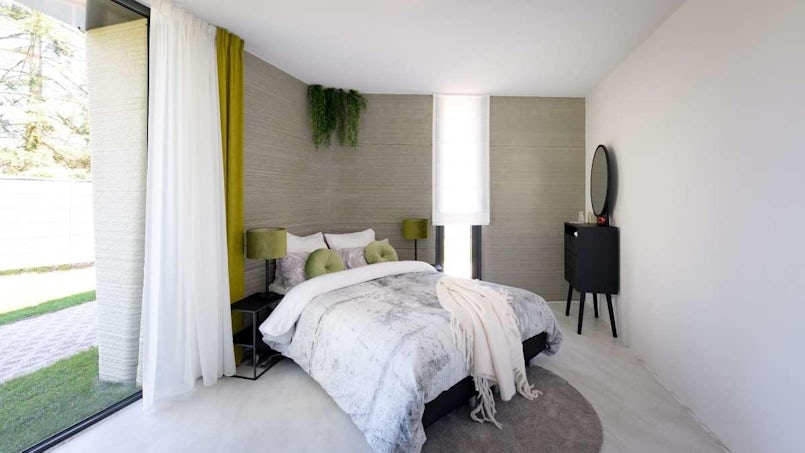 De afgeronde hoeken van de woning maken sfeervolle inrichting mogelijk, de betonwand met reliëf blijft in het zicht (foto: 3Dprintedhouse)