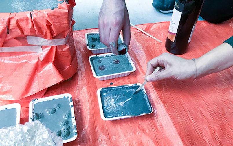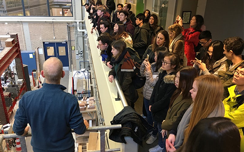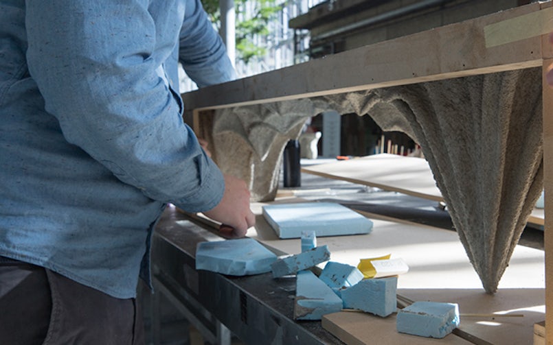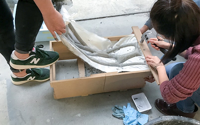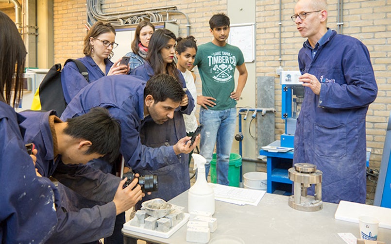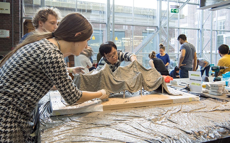 Bij de inschrijving voor het keuzevak Making bleek dat veel masterstudenten Architectuur (Complex Projects & Form Studies) en Civiele Techniek maar wat graag meer praktische kennis willen opdoen met beton. Het maximum aantal deelnemers van 40 was binnen de kortste keren bereikt. Ongetwijfeld vanwege de doe-factor: je eigen betonnen constructieve element ontwerpen en zelf maken in een hands-on workshop. Praktijkgericht, ontwerpend onderzoek startend vanuit het materiaal beton staat namelijk centraal in Making. De studenten hebben kennis opgedaan van verschillende typen beton, onder andere door een serie prisma’s te storten en constructief te beproeven. Speciale aandacht was er voor gerecycled beton: wat is het precies en vooral wat kan je ermee? In korte pitches presenteerde de studenten hun bevindingen en resultaten.
