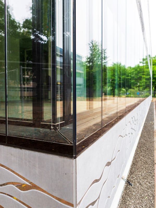Na het bekijken van een groot aantal foto’s, besloten architect en constructeur een ingezoomd beeld van meanderende stromen in een delta als voorbeeld te gebruiken. Daar is een abstract patroon van gemaakt. Toen rees de vraag hoe je de suggestie van waterstromen zou moeten realiseren. Wim Sjerps, senior-architect bij Barcode: ‘Wat wij heel gaaf vonden aan zo’n deltalandschap is die schittering die je altijd hebt, en de veranderende reflectie.’ Zo groeide het idee om een gevel te creëren waarbij roestvast staal werd ingelegd in beton.