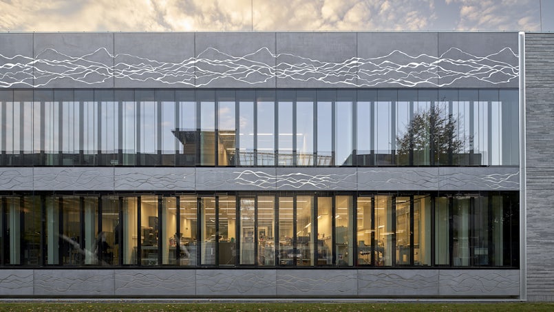 Water dat zich kronkelend een weg baant door droogvallend wad of een rivierdelta. Dit soort beelden doemt direct op bij het zien van de opvallende gevel van het Earth Simulation Laboratory (onderdeel van het Utrecht Science Park). De bijzondere façade bestaat afwisselend uit doorlopende banden van glas en betonnen geveldelen, ingelegd met gepolijst rvs.