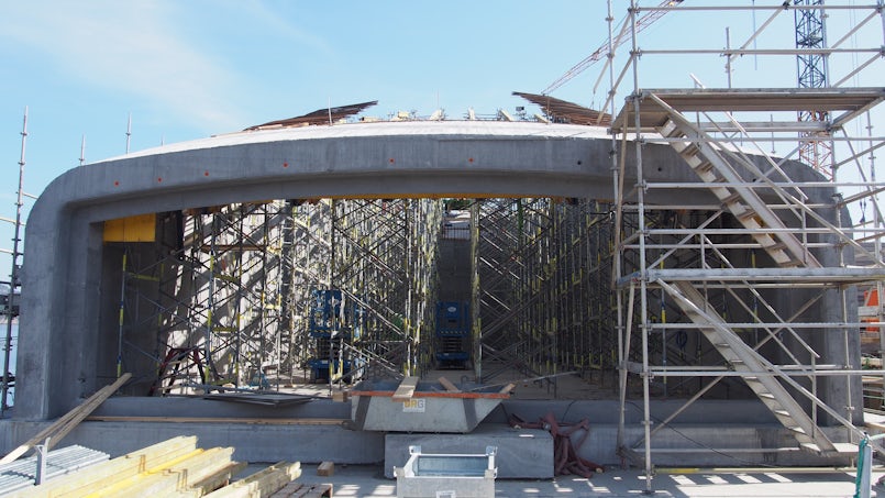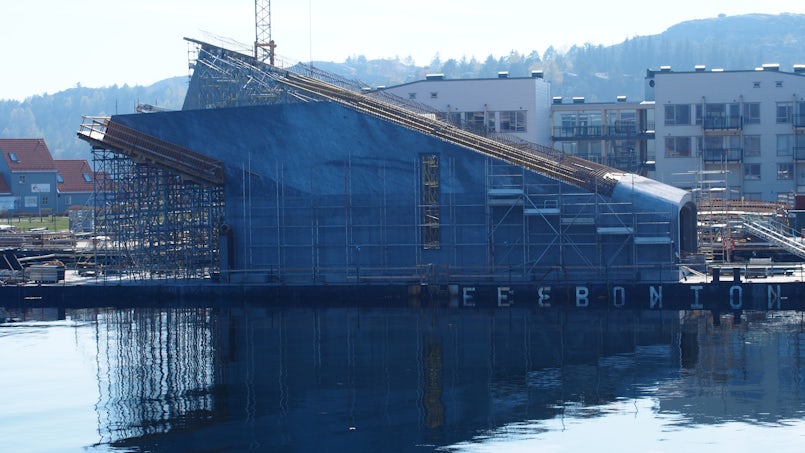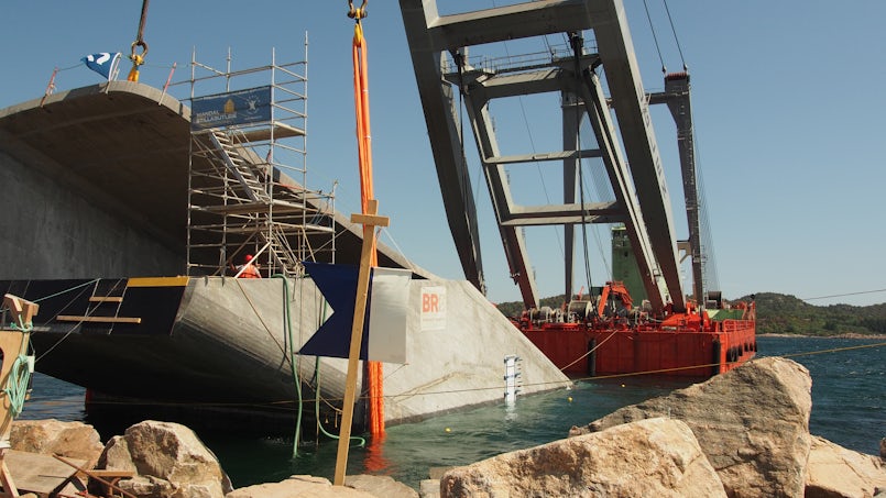 Met behulp van een hijskraanschip is het casco naar de exacte locatie verplaatst en is het ponton verzonken, zodat het geheel ging drijven. In het casco zijn plastic waterreservoirs gevuld om het geheel gecontroleerd te laten zakken. Duikers hebben de ogen over de draadeinden geleid en vastgeschroefd. Daarna zijn de watertanks leeggepompt en konden de inbouwwerkzaamheden van start gaan. De bouw heeft in totaal iets meer dan een jaar in beslag genomen.