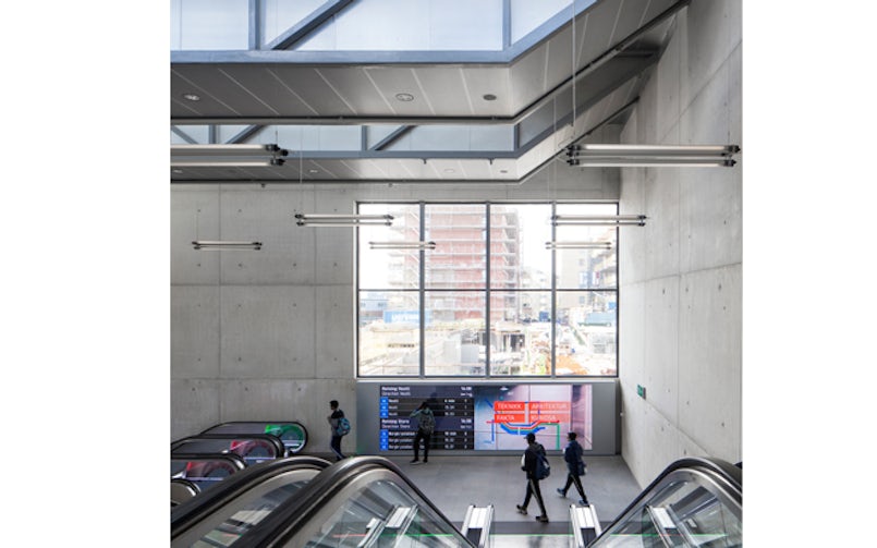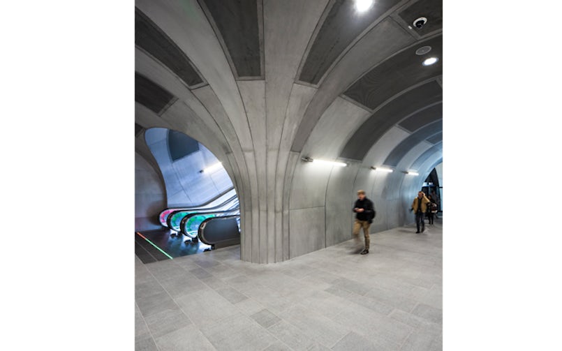 De materiaalkeuze kwam deels voort uit de bouwtechnische uitgangspunten. De twee entreegebouwen zijn opgebouwd vanuit bouwputten. Beton was zodoende het meest voor de hand liggende constructiemateriaal. “Omdat beton een belangrijke constructieve functie vervult, wilden we zo veel mogelijk van de betonnen structuur blootleggen. Wegens akoestische eisen was het niet overal wenselijk om het betonoppervlak van de draagconstructie onbedekt te laten. Daarom hebben we ook stalen wand- en plafondbekleding toegepast. Dit materiaal leende zich goed voor het integreren van akoestische elementen en verlichtingsarmaturen.” Het staal is geborsteld en heeft daardoor een zeer mat oppervlak. Het matte staal benadert de kleur van het onbehandelde beton. Doordat kleur en textuur goed op elkaar zijn afgestemd, dragen de materialen bij aan de samenhang tussen de verschillende stationsruimtes.