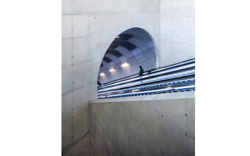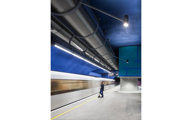 “We hebben via deelname aan een competitie de opdracht voor het ontwerpen van het metrostation verkregen”, aldus Helge Lunder, architect MDH arkitekter. De positie van het nieuw te bouwen ondergrondse station met de twee entreegebouwen was op voorhand vastgesteld op basis van een technische rapportage. Factoren zoals geplande bouwprojecten op en naast het station, de ligging van het bestaande metronetwerk, de curve van belendende tramlijnen en de geologische samenstelling van de bodem, zijn meegenomen in het vooronderzoek. Lunder: “Speerpunt van ons ontwerp was het maken van een veilige en ruimtelijk interessante route vanaf de entree naar het ondergrondse perron. Om daglicht zo veel mogelijk te kunnen benutten, hebben we de route per roltrap gespreid in drie delen. Hoewel daardoor een aantal uitgangspunten van het technisch rapport op de proef zijn gesteld, heeft het idee bijgedragen aan het winnen van de competitie.”