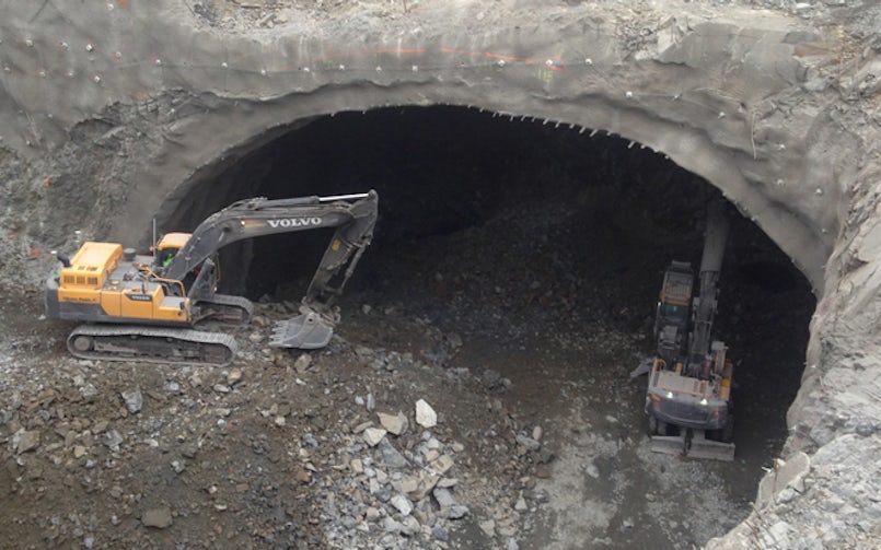 De tunnel is gerealiseerd met de zogenoemde schildmethode, waarbij de tunnel onder de grond wordt gebouwd met een tunnelboormachine. Om de overtollige grond te verwijderen is gebruikgemaakt van expolosieven. Deze manier van bouwen van bergtunnels komt in Noorwegen veel voor. De gewelfde tunnel is daarom niet voorzien van een verlaagd plafond, maar slechts bedekt met een folie en een laag spuitbeton in diepblauwe kleur, om de rondingen te accentueren. Een ander beeldbepalend element op het perron is de luchtbehandelingsinstallatie. De grote roestvast stalen kanalen dragen bij aan robuuste uitstraling van het station.