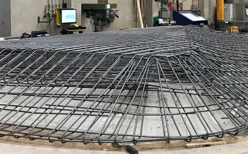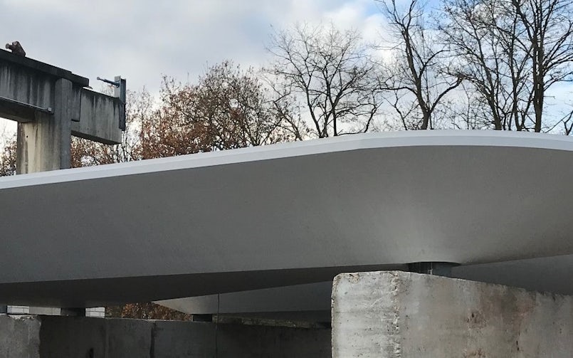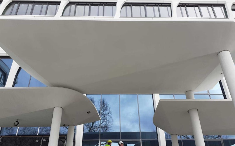 De gevelelementen zijn met behulp van houten mallen gemaakt. Naast de wapeningsnetten zijn ook roestvrijstalen schroefhulzen meegestort; daaraan zijn de ankers bevestigd waarmee de elementen aan de achterconstructie zijn bevestigd. De 1.034 gevelelementen zijn in een periode van tien maanden gemonteerd met meerdere kranen en montageploegen. ‘Next level prefab’ noemt Byldis het project. De luifel vormde daarbij een extra uitdaging, vanwege de complexe gekromde vormen. De wapeningsvlechters werkten in dit geval niet met platte tekeningen, maar produceerden de wapening rechtstreeks vanuit een 3D-model. Het is een ‘les’ die Byldis nu ook bij andere projecten toepast.