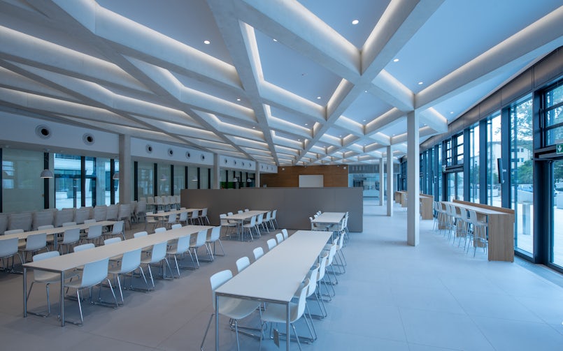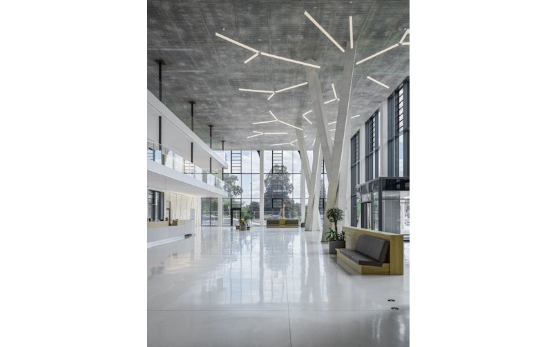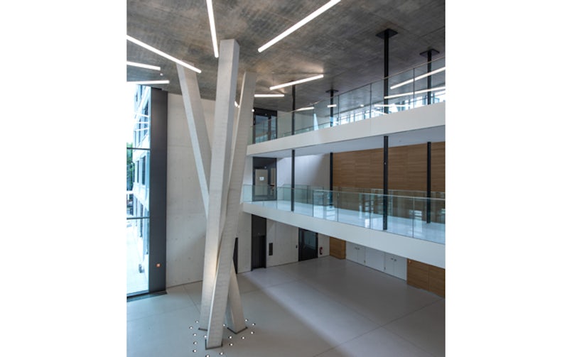 Natuurlijk moest het complex, dat 50.000 m2 groot is, en plaats biedt aan 1.000 medewerkers, ook functioneel en efficiënt zijn. De ruimtes zijn licht en transparant en zo veel mogelijk open ontworpen, passend bij het hedendaagse flexwerken. Tegelijk fungeert het complex als een ‘toonzaal’ voor betonnen toepassingen; in het casco is 32.000 m3 beton verwerkt. Je loopt het gebouw binnen onder een sierbetonnen luifel, in het atrium wordt je blik getrokken naar de spectaculaire ‘boom-kolommen’. Voor deze ranke, in het werk gestorte kolommen is zelfverdichtend, fijn zichtbeton met de hoogste klasse SB4 gebruikt. Bijzonder aan het bouwproces is dat de bekisting van onderaf werd gevuld, waarbij het beton omhoog werd geduwd tot een hoogte van 11 m. Deze kolommen en de trappen zijn de enige dragende elementen in het interieur.